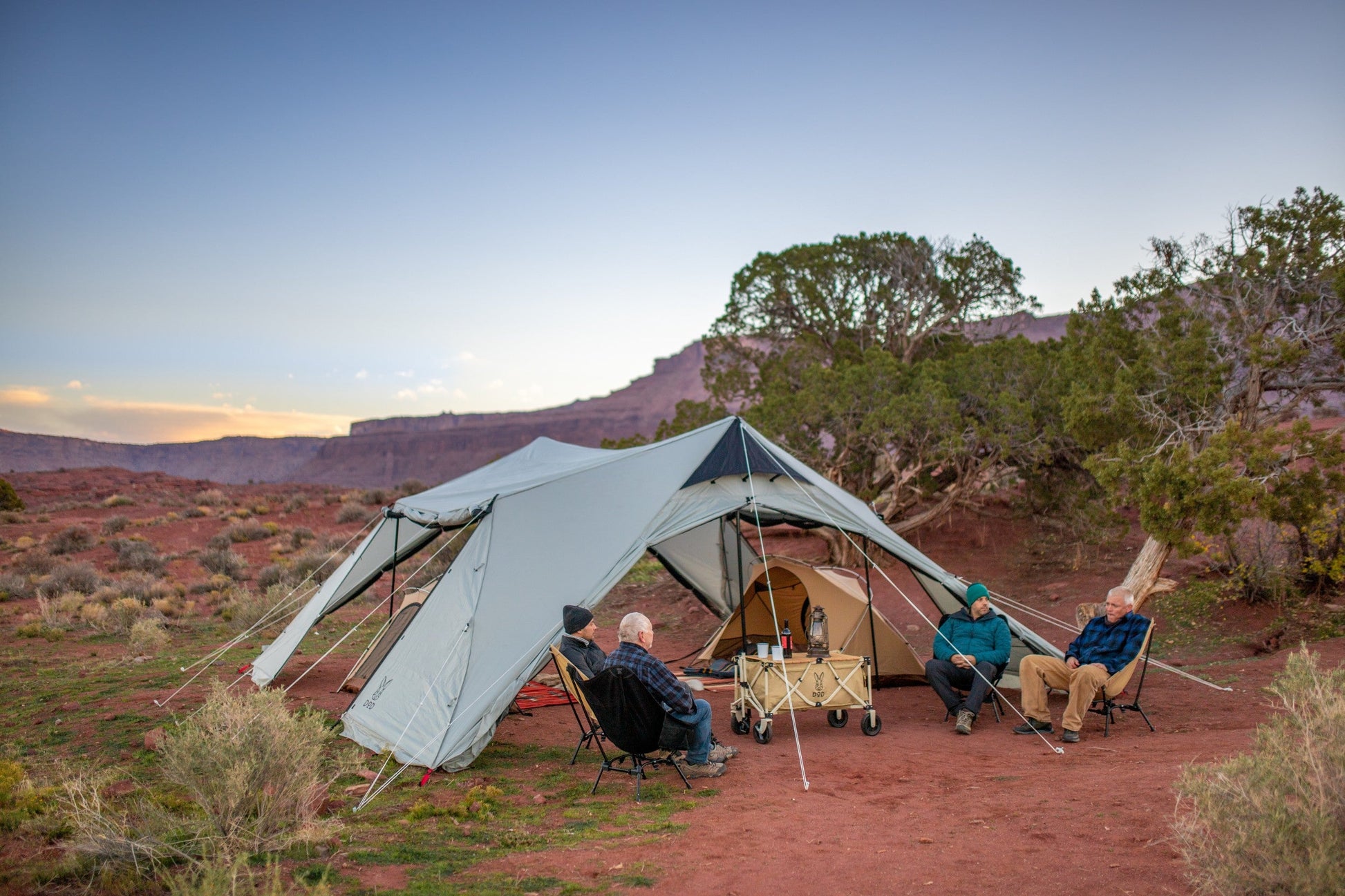 Bring the whole crew with our 6x6 package - our biggest tent. The 6x6 Super Tent, with a 388 sqft footprint, is a massive sun shelter during the day, a lounging area in the evening, and a sleeping area at night. Sleeping space for up to 12 adults comfortably, maximum 16. Pitch your dome tents or add cots to sleep even more people. Sugoi chairs provide seating for 4, plus the removable Kama Zashiki provides a massive waterproof floor area for lounging. A wagon gets all your gear from the car to the campsite, then doubles as a table.