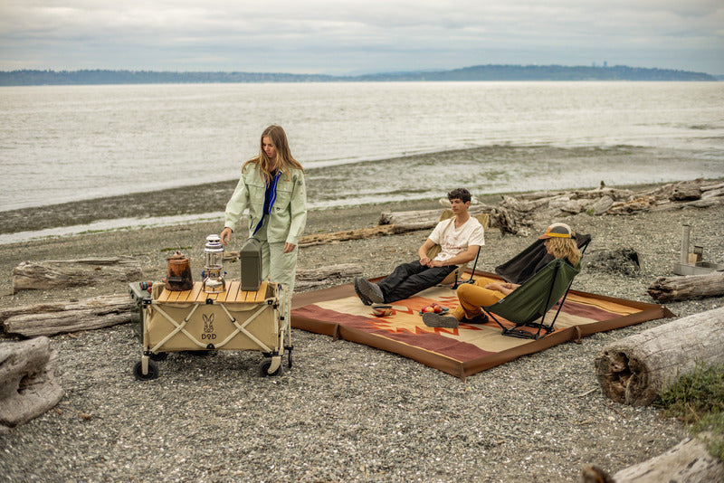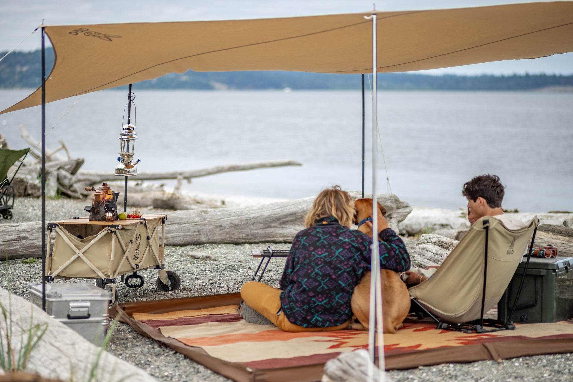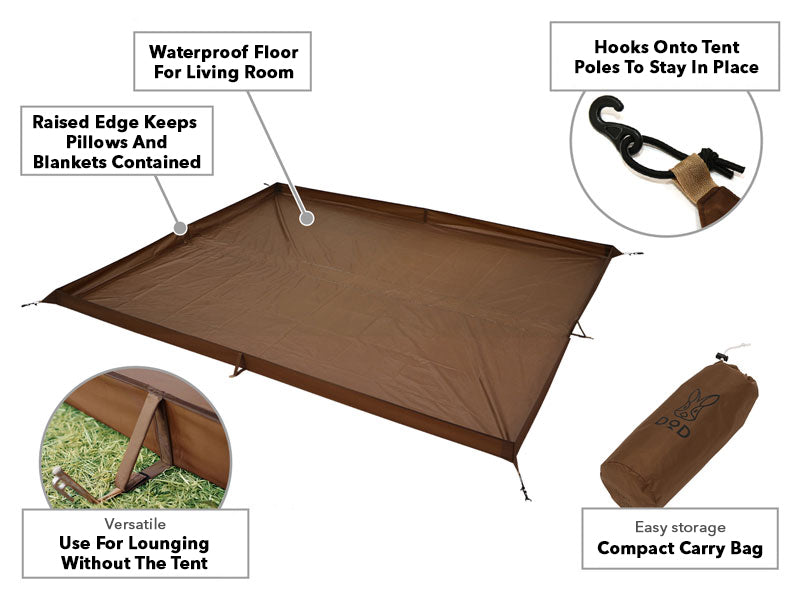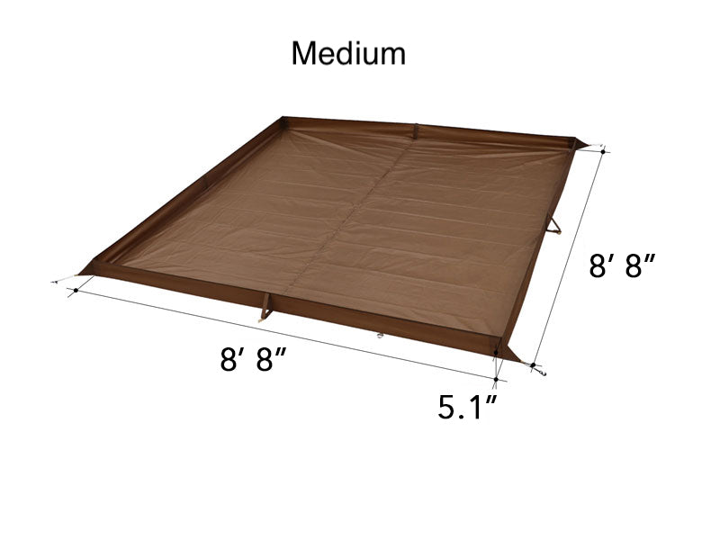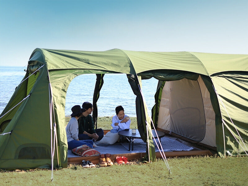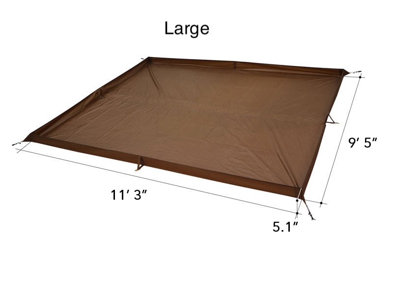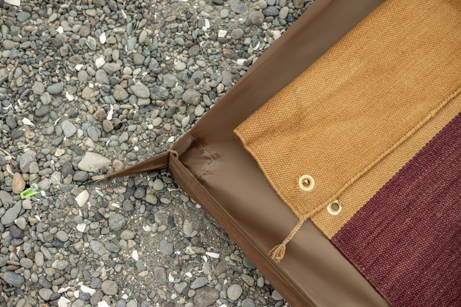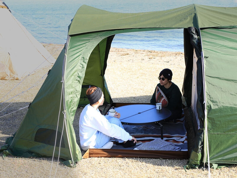 The Kamaboko Super Tent converts to a lounge with this removable tent floor. Spread it out, hook it to the tent frame, pile up rugs, blankets, and pillows, and lounge in comfort. The raised edges keep everything in place. When you need to put that section of the tent to another use, just roll it up and set it aside. Perfectly fits the free area of a Kamaboko Super Tent with one inner tent installed (M and L will be available October 2025).