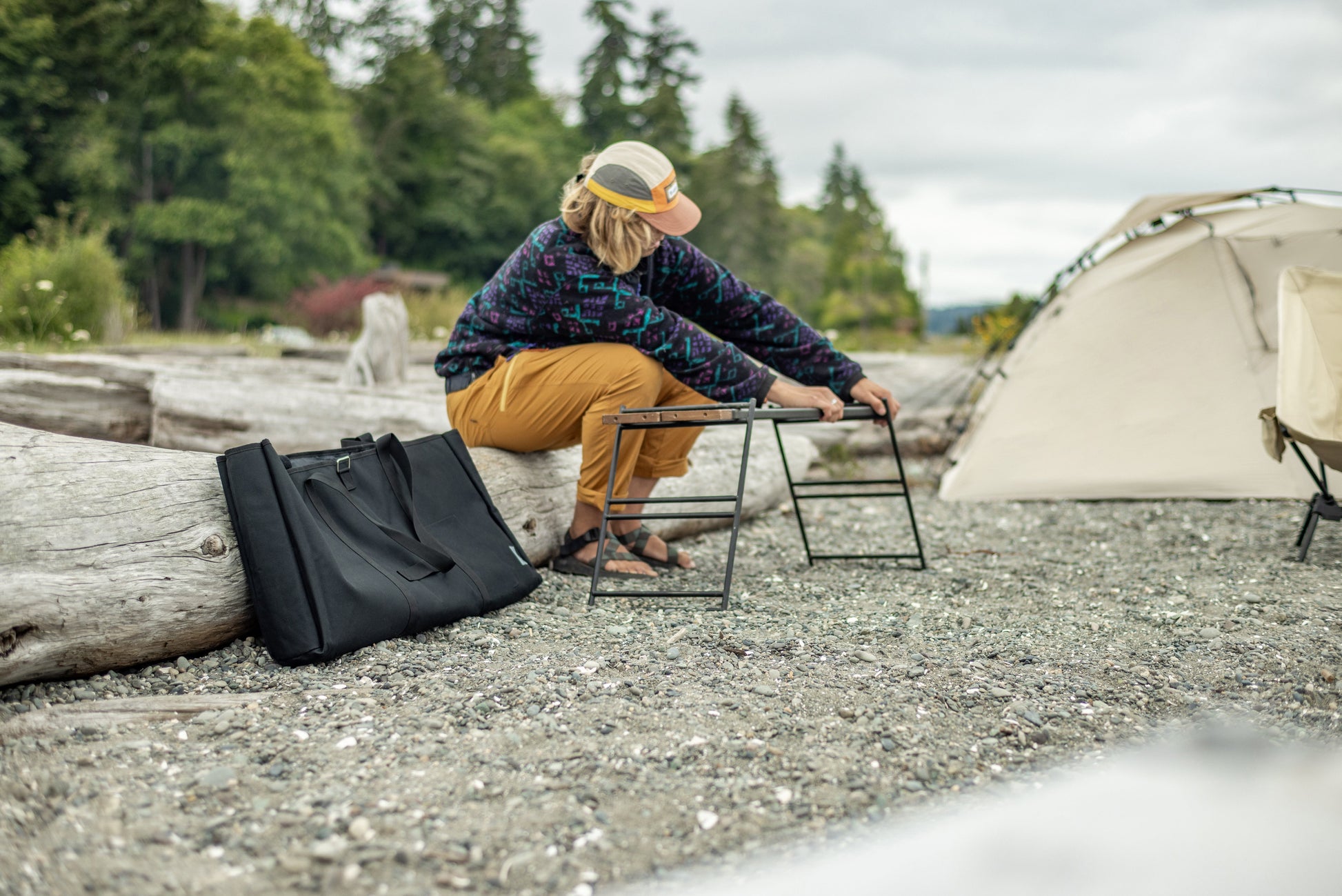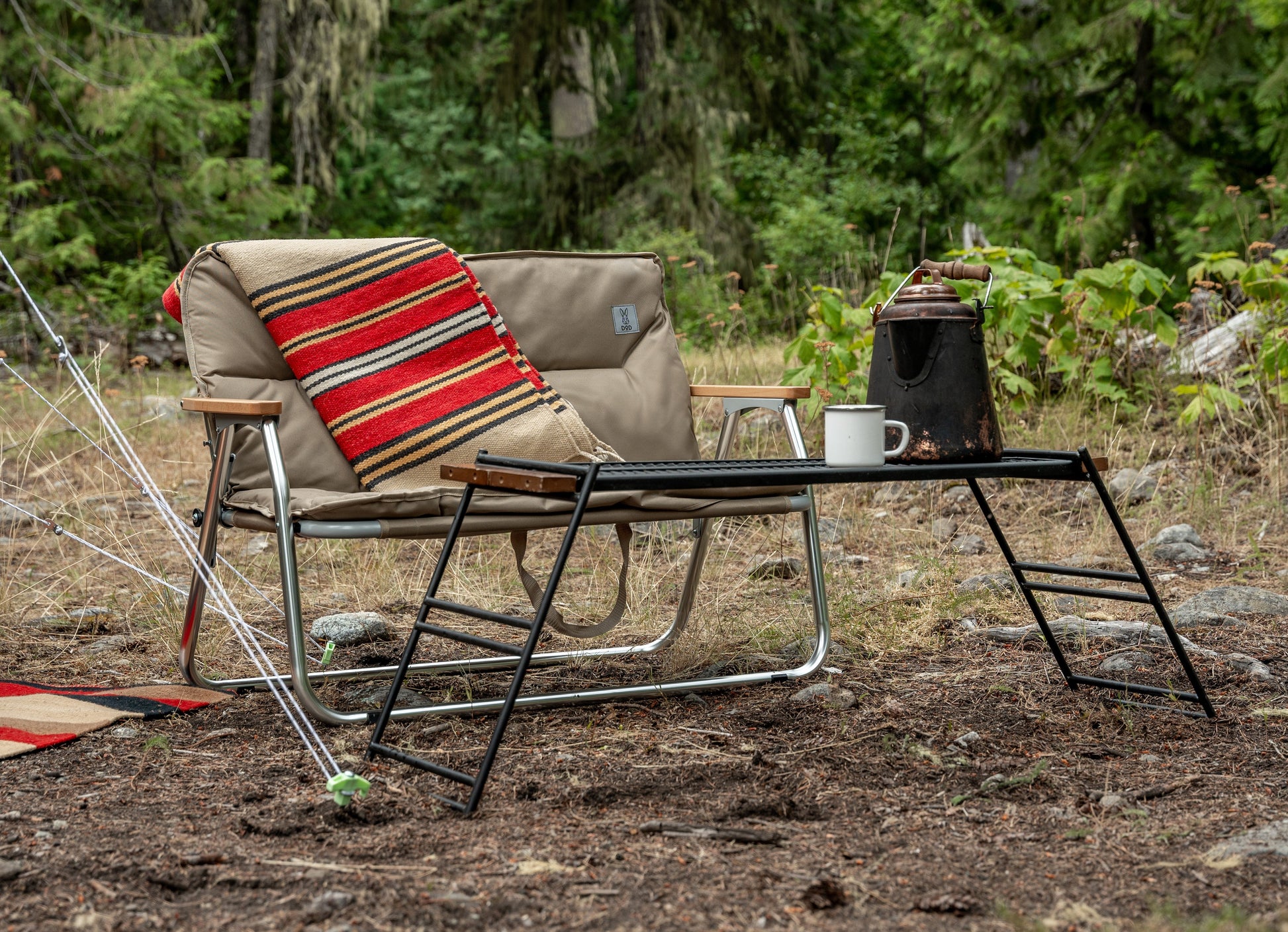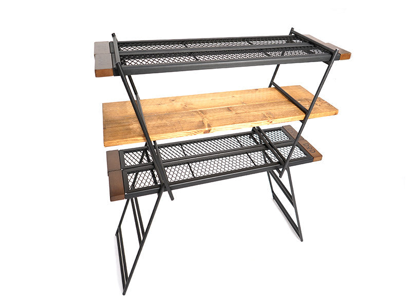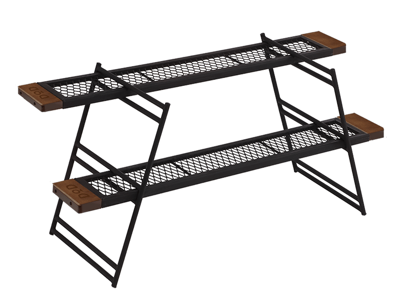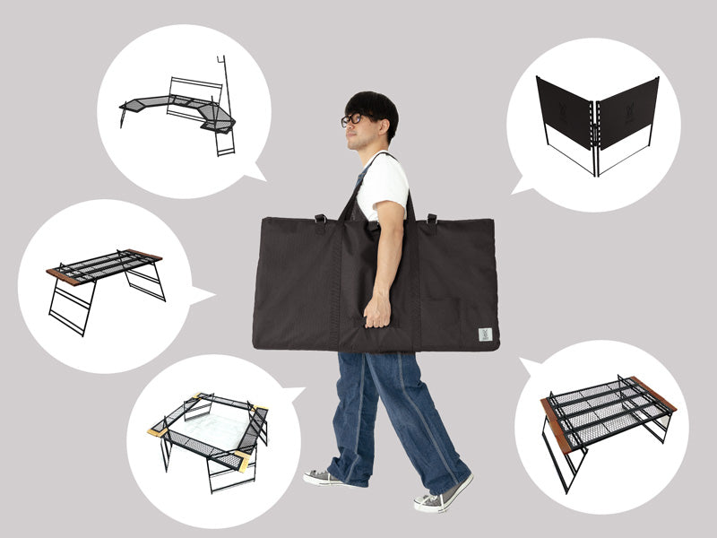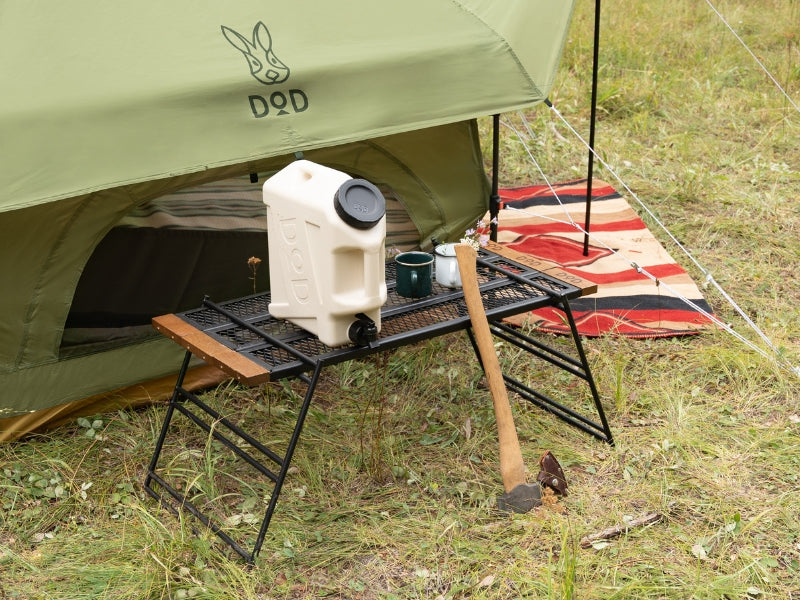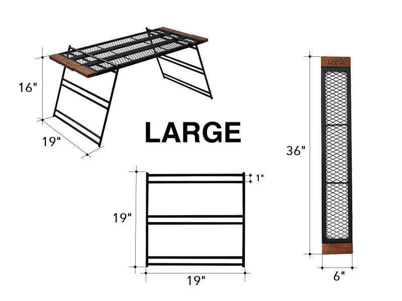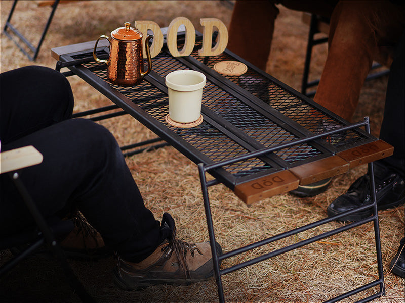 The Tequila Table, available in large (L) and medium (M) sizes, is a durable and versatile camping table. The L size includes three slats for a wider surface, while the M size comes with two. Made from tough iron, it can withstand use over a bonfire and features a special coating resistant to peeling under heat. The table's design allows for various configurations by adding extra plates and legs or using one-by-wood for customization. Its wooden edges provide a comfortable grip, updated to scratch-resistant beech wood for enhanced durability. (For a limited time, comes with custom carry bag).