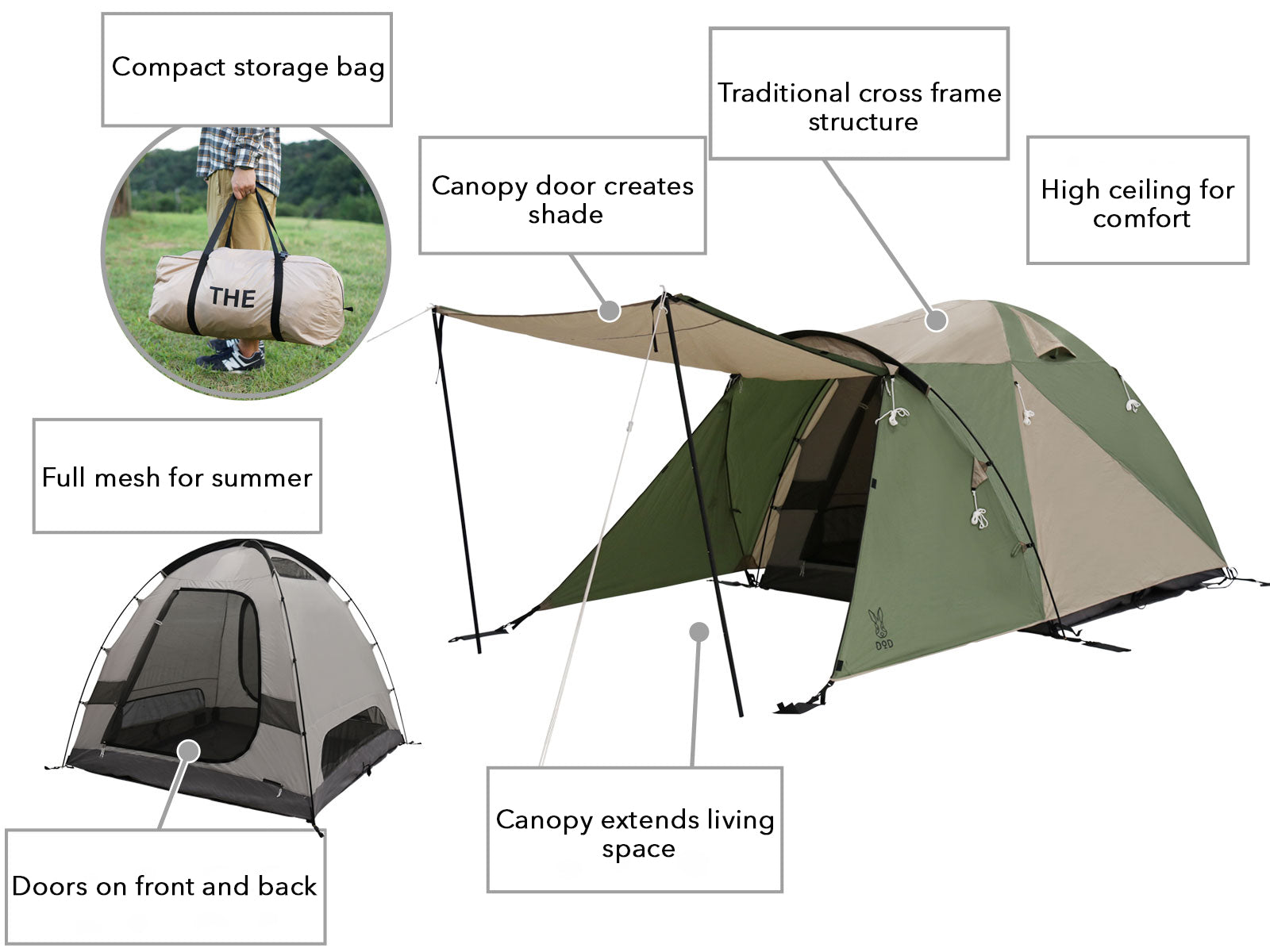 THE Dome Tent epitomizes classic tent design with its orthodox dome shape and crossed poles. Its simplicity makes for easy setup, and the added front room offers a relaxing space. This tent comes with a ground sheet to protect it and is made with durable 150D fabric. It features ample space, with a high ceiling in the inner tent and a large front room that can be extended into a canopy area for additional living space. (For a limited time, comes with Kiso Tarp Poles for awning). (Large has been discontinued).